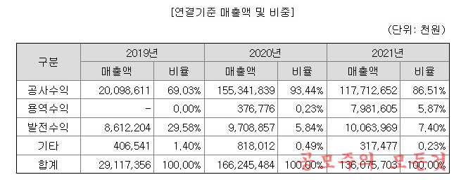 이 매출은 거의 공사수익에서 발생하고 있으며, 그 다음으로는 발전소 수익이 차지하고 있습니다.